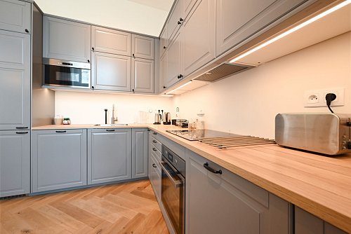 - Kuchyňská linka na míru vybavena elektrickou indukční varnou deskou, horkovzdušnou elektrickou troubou, digestoří, vestavnou lednicí, myčkou a pračkou.