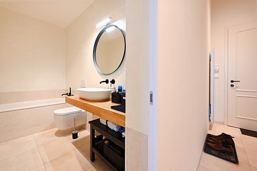 - Vytápění centrální, radiátory, v koupelně podlahové topení, ohřev TUV vlastním elektrickým bojlerem.